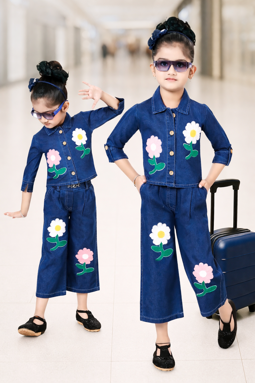 Denim Built for Sunshine and Smiles The Honey Love “Floral Garden” set is designed for the girl who loves the timeless durability of denim but wants a burst of color in her wardrobe. This perfectly coordinated ensemble is a boutique favorite for travel, playdates, and everything in between.